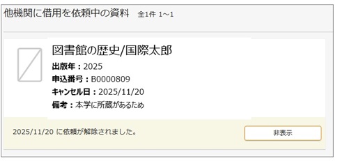 図書館に所蔵があってキャンセルになった場合にも、この画面にて確認ができます。