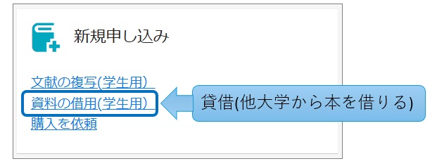 CiNii Booksで見つけた他大学の資料の借り受けを希望する場合(貸借依頼)には「資料の借用」を クリックします。